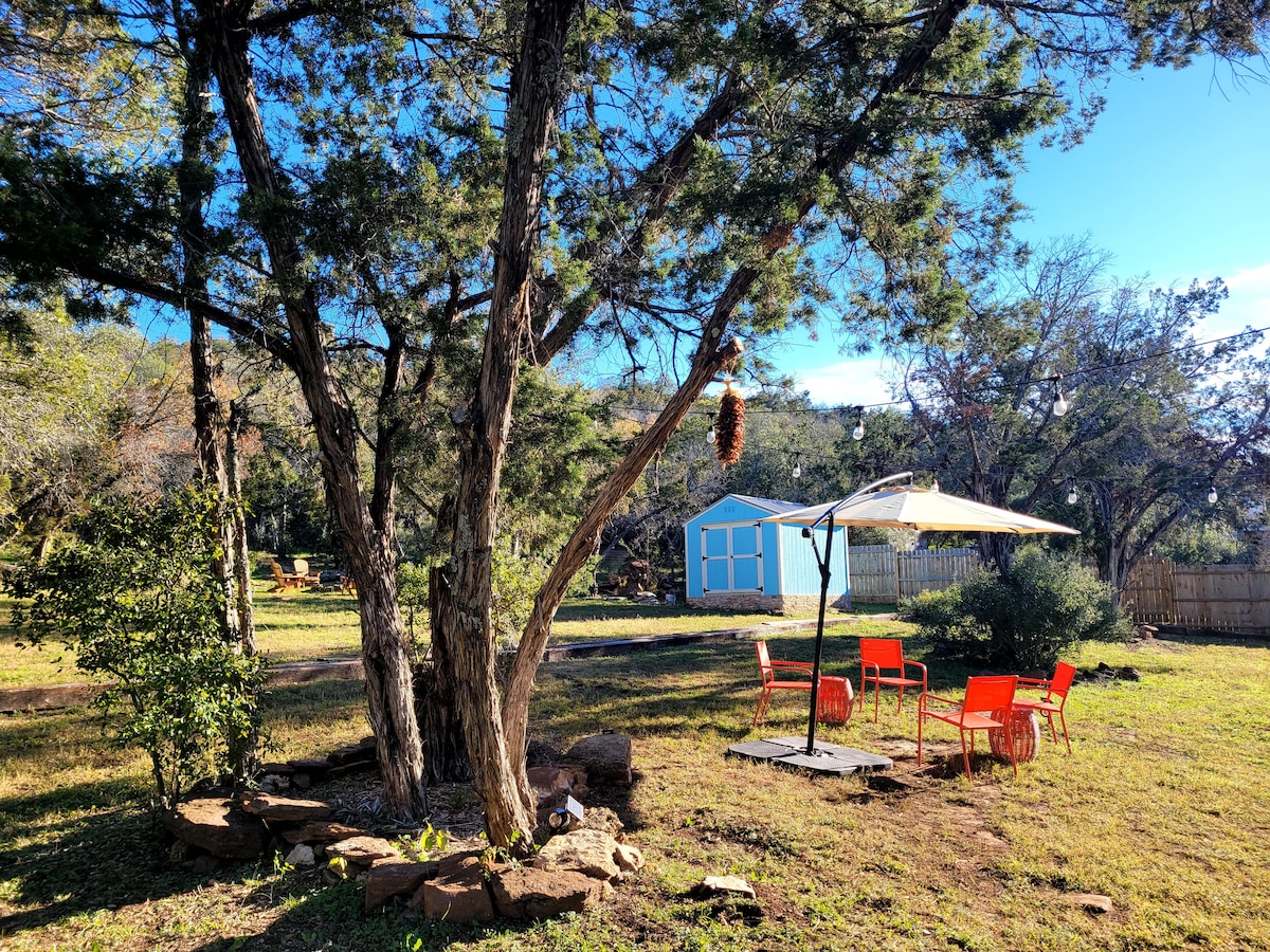 Relax and unwind at this romantic getaway under a canopy of pecan trees with a yard full of deer. Float Lake Marble Falls and fish in one of 2 kayaks. Quaint 500 square foot suite for visitors who want to spend time hiking or kayaking. Grill a meal at the cabana and finish the evening building a crackling fire under the stars while sipping a glass of wine! Perfect for a couple with possibly one child or girlfriends who share a bed! *Cabana will have spider webs, nature always wins!