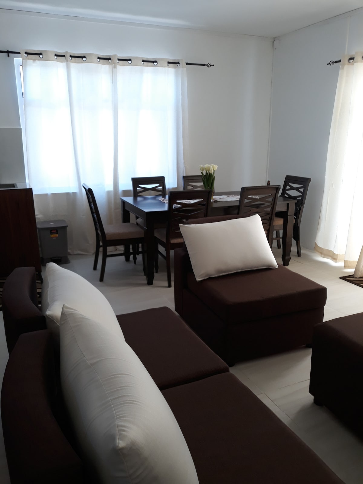 Newly built apartment on first floor with two bedrooms equipped with A/C, spacious living room with tv, kitchen and bathroom with washing machine, whereas the ground floor is occupied by my family and I. The house is located 20mins drive to the Belle Mare public beach and 5mins walk to the pier, where you can take ferry boat to ile aux cerf(small island in the east coast famous for its beaches and water activities). You can get in touch with me as well for any booking to the island.