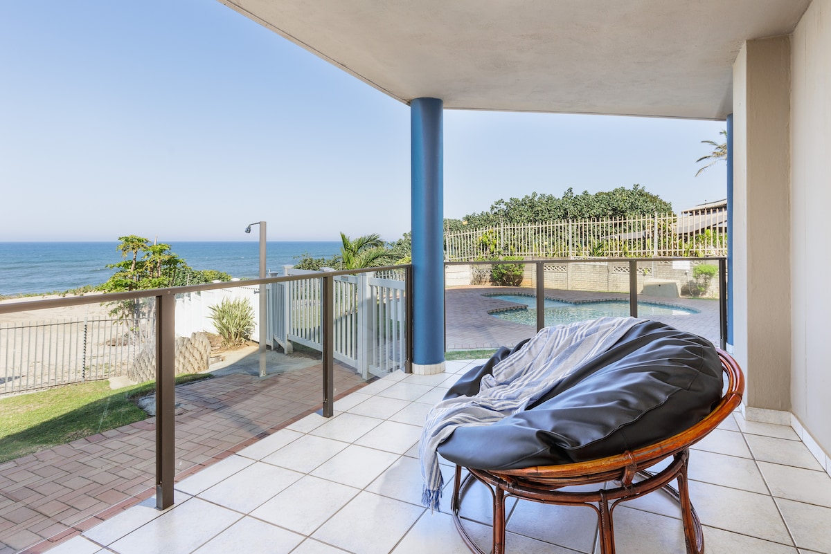 Beach front unit, 180° unobstructed sea view 50m from Uvongo Beach. Sleeps maximum 5 adults. ( 2 bedrooms / 1 bathroom ) Main room - double bed, Second room- 2 x singles bed, Sleeper couch in the lounge for the 5th guest. 2 smart flat screen TVs, Free Netflix. Unlimited Fibre wifi Sparkling communal Pool and seated braai areas. Designated secure under cover parking for medium sized car
