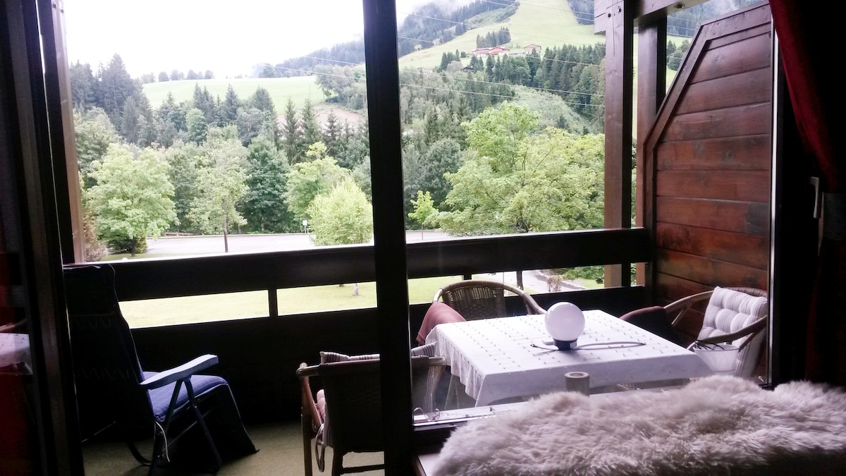 Cosy Studio with mountain view and big loggia. Living room with a double bed and an extra Sofa bed. Dining area, seperate kitchen, Bathroom with a bath, hallway. Free parking. 5 Minutes walk to the supermarket and bakery. 10 min. walk to the village Maria Alm. There is a direct connection to the "Hochkönig" ski area. Family skilifts Hinterreit across the street. 15 minutes by car to the skicircus Leogang/Saalbach/Hinterglemm. Glacier skiing Kaprun/Kitzsteinhorn is nearby.