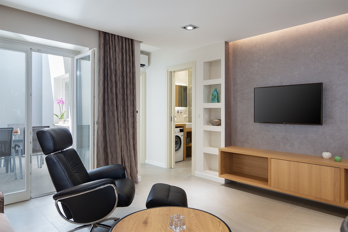 A spacious living area features a corner sofa with cushions and a coffee table. The flat-screen TV is mounted on a stone wall, and artwork adorns the opposite wall. A door leads to an outdoor area, allowing natural light to fill the space.