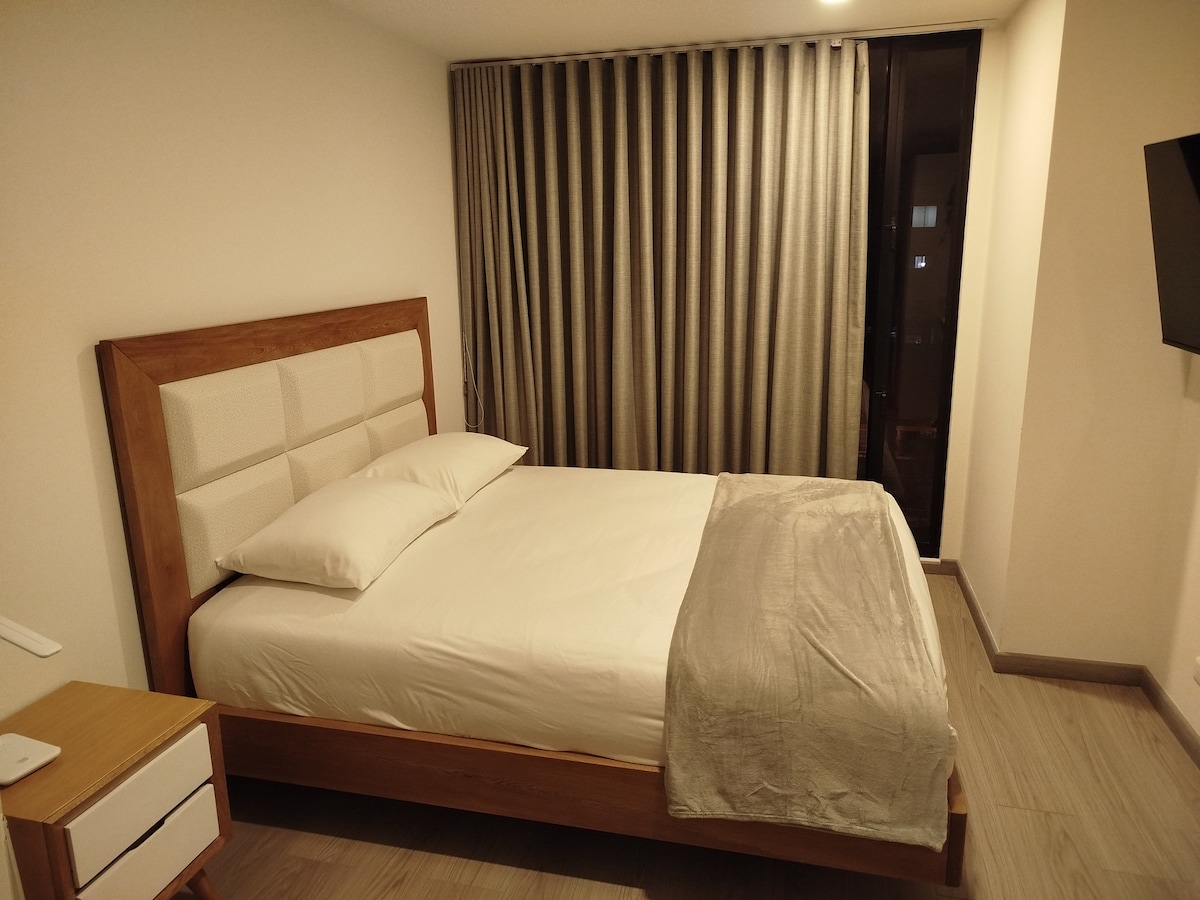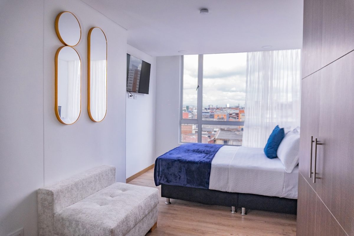 Charming suite in the heart of Bgtá, ideal for couples or travelers. Elegant decor, equipped kitchen and comfortable double bed. Private balcony with stunning views, Social Areas such as Laundry Area, gym, pool table and ping-pong, CoWo, BBQ terrace on the top floor with 360° view and 24-hour security. Close to markets, museums, restaurants in La Macarena, Monserrate, La Candelaria, Mall San Martín and the International Center. Discover the best of Bogotá from this wonderful Suite!