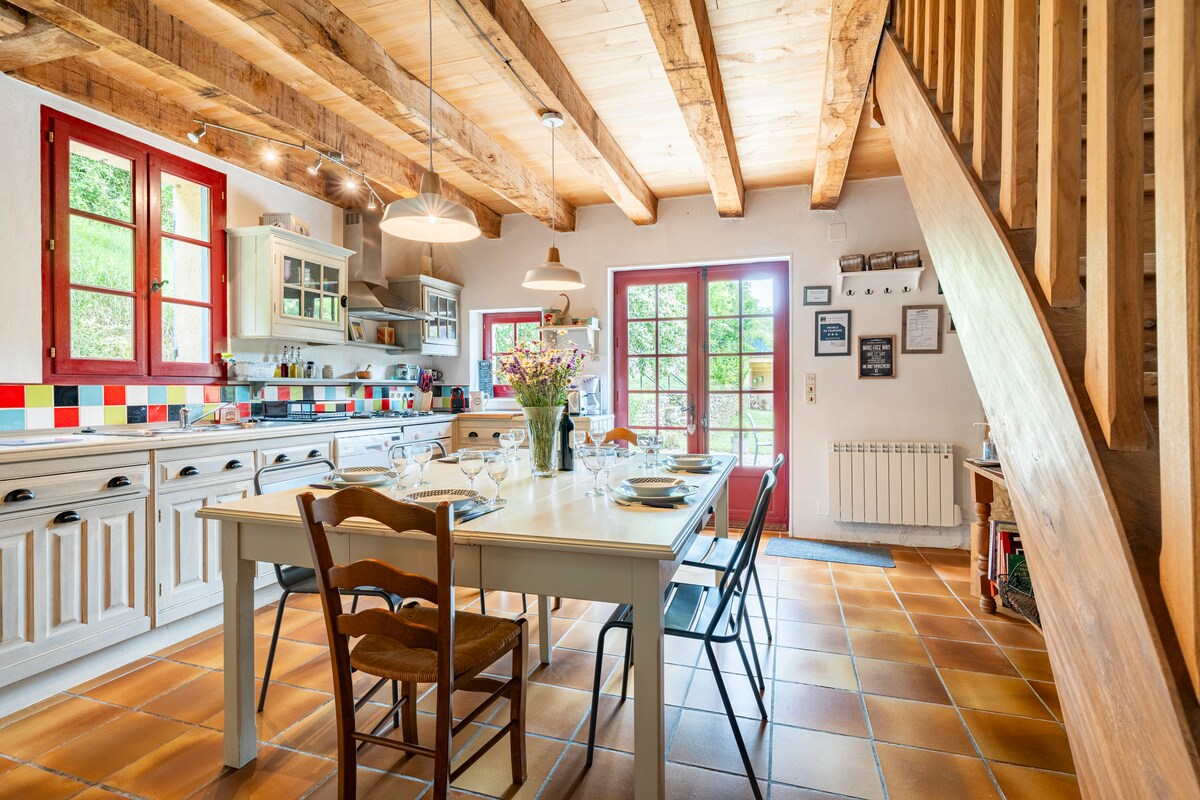 Welcome to our gorgeous country home nestled in rolling, forested hills. Enjoy an exceptional 180° view of the Dordogne while swimming in our infinity pool (open May to October only) or hot tub (available all year). Our property sits on 4 acres of tranquil countryside at the top of the verdant Dordogne valleys. Sit back, have a glass of wine, and watch the hot air balloons paint across the sky at sunrise or sunset. Use our bicycles to explore the locale or BBQ outside and take in the scenery.