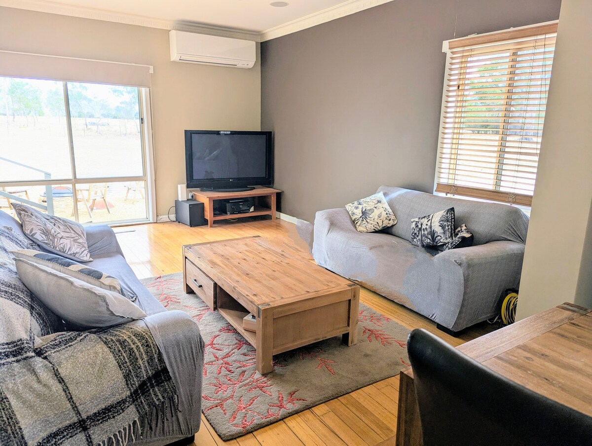 Mud-brick with timber bathroom, built only with natural / recycled materials, our cottage is nestled amongst granite boulders and beautiful native gardens with views to the Grampians. Close to Gt. Western wineries, Ararat cafes and the Stawell Gift!