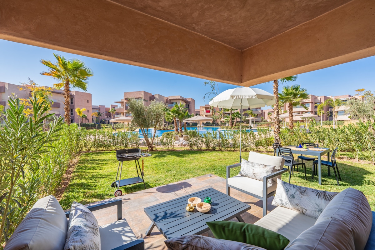 Treat yourself to an exceptional stay in a prestigious golf estate, combining calm and refinement at the foot of the Atlas Mountains. This elegant apartment has a private garden and direct access to the pool, for moments of relaxation in complete privacy. Air-conditioned and fully equipped, it guarantees optimal comfort in a serene and luxurious setting. Perfect for families or friends looking for tranquility and elegance. 3 min: Airport 5 minutes: M Avenue 2 min: Carrefour