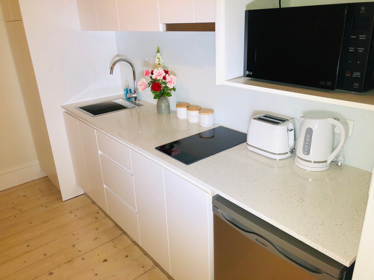 Enjoy a short or long stay in our beautiful, newly refurbished studio apartment in the heart of Newtown. Perfect location 2 minutes walk from Newtown train station, close to all the action yet located at the rear of a boutique apartment building and therefore very quiet. Safe and secure with intercom, the studio is set around a light filled atrium and features a stunning roof top garden with views of the whole local area. The rooftop has tables, chairs and a lounge for your morning coffee!