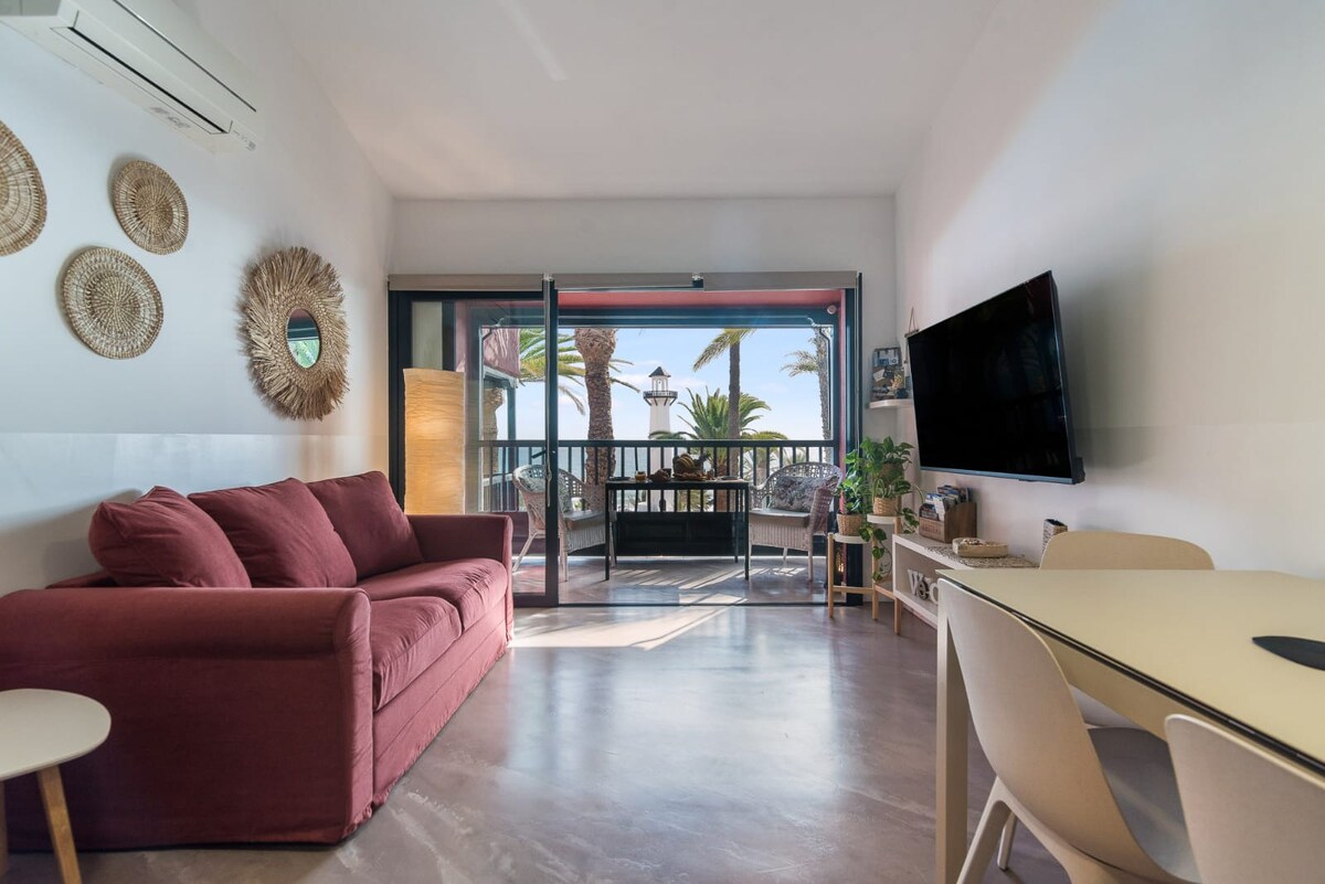 Cosy apartment located on the beachfront. Perfect for quiet vacations. Enjoy the sea view from the balcony and the closeness of the beach. The sand is a few steps from the apartment and the complex has a private access to the beach. The ideal place to escape from the routine and stress, enjoying one of the best sunrises of the island. The apartment is fully equipped so you will have everything you need for your stay. The boho-chic decorated living room has a 65-inch TV and a bed couch. WifiTOP