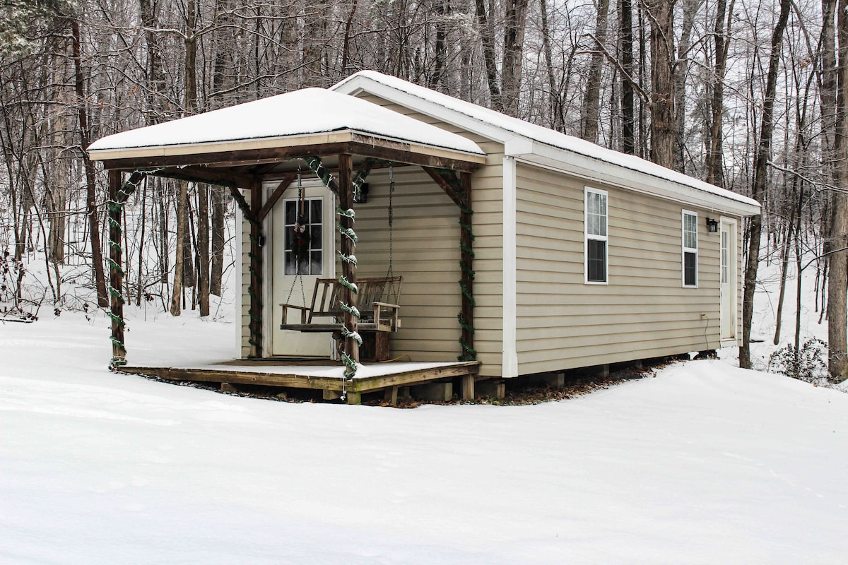 This peaceful cottage has a rustic, yet modern feel to it. It is set on the edge of a wooded area with plenty of wildlife to enjoy, near Massanutten Resort. Enjoy the ambiance of the small electric fireplace, well-equipped kitchenette and dining area, or the front porch swing. The bathroom features an old-fashioned claw foot tub, fitted with a shower head. Enjoy a complimentary bottle of sparkling cider and a basket of snacks with your stay. We look forward to extending our hospitality to you.