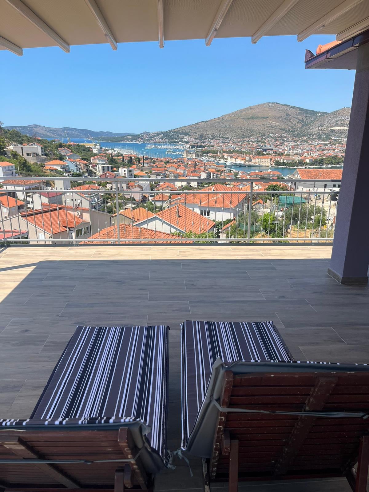 Cozy studio with a stunning sea view with shared terrace. Located by the beach, just 2 km from Trogir, this small but fully equipped studio is a great base for your vacation in central Dalmatia. A beautiful pebble beach is right across the street — just a few steps away. The terrace is shared between two studios, with a designated area in front of each for private use. Please note that during peak season, street parking can be difficult to find, even further from the house.
