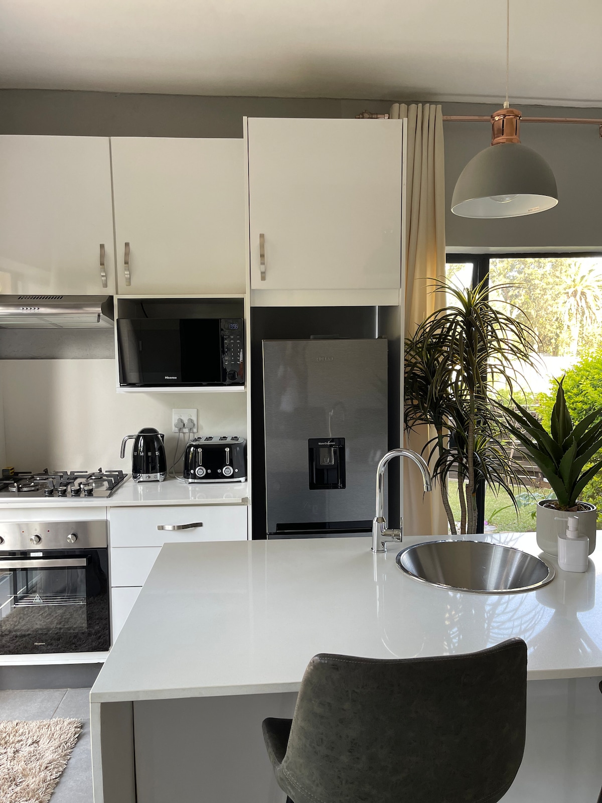 Set in a dramatic garden, this guesthouse has all the comforts with an artsy flair. The cottage is fully equipped includes a kitchen and lounge, sun deck, private garden, two bedrooms and two bathrooms. The cottage is family friendly, tastefully furnished with local antiques and up-cycled materials. A comfortable base for business, visiting relatives or exploring. Large silent generator. Wifi &DSTV. We love hosting families.