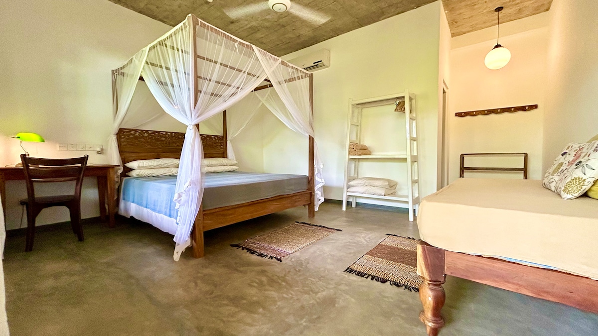 "Mirissa Bed and Breakfast" NEWLY TILED (Feb 2025) bedroom floor. Enjoy our garden with the breezy breakfast house, the chill-out space on the first floor and our rooftop, which is perfect for watching the sunrise with a coffee or the sunset with a chilled beer. We are serious about style and comfort! Our individually styled rooms are bright and spacious, with private attached bathroom, AC, and a desk and a chair for those who want to work.