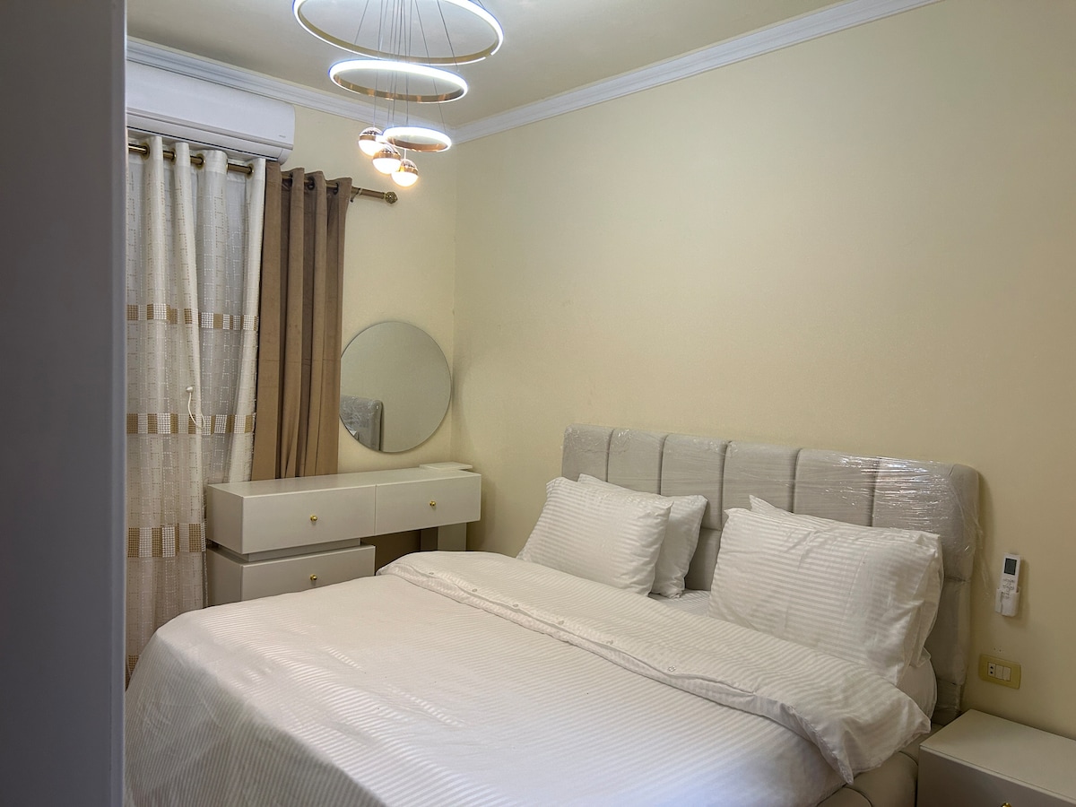 Tilal el Fanar resort, 145sqm, 2 bedrooms with a queen-size bed and 2 single beds, a double sofa bed in the living room, 2 full bathrooms, a fully equipped kitchen, a patio-with outdoor furniture and BBQ. A big living room with TV and wide windows that flood the space with natural light. A dining room area to share meals with your loved ones. 2 private parking lots underground) The resort has a swimming pool, tennis courts & gym. Generator, electricity and wifi are INCLUDED in the price.