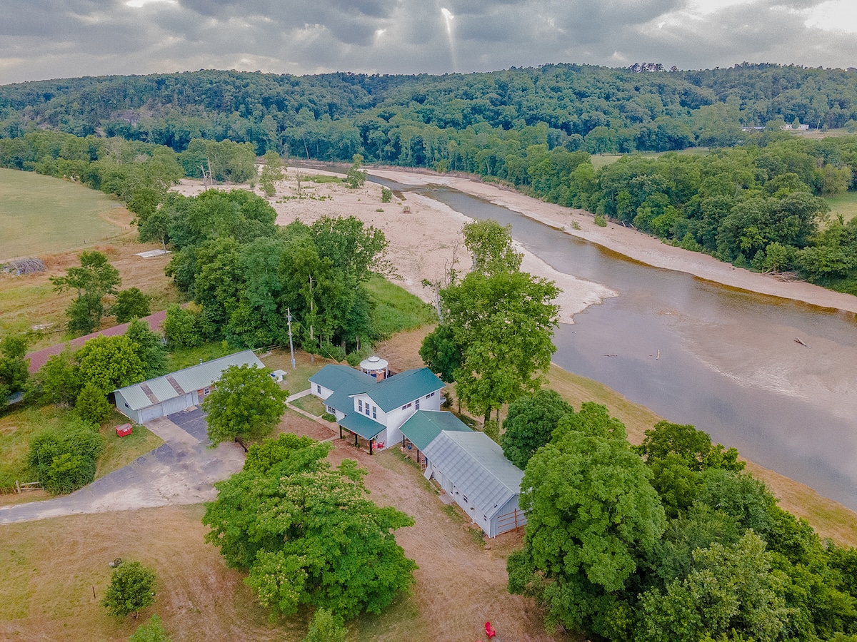 Welcome to the Mimosa Riverside Ranch on the Elk River in Noel, Missouri, a 15 acre country paradise ideal for family vacations, weekend getaways, work retreats, family reunions, weddings, and other events. Located behind a rustic gate at the end of a secluded dirt road, and with an enormous river front beach, Mimosa Riverside Ranch is truly an Ozarks Oasis. The Farmhouse is a 2 bedroom and 2 bathroom house that sleeps 12.