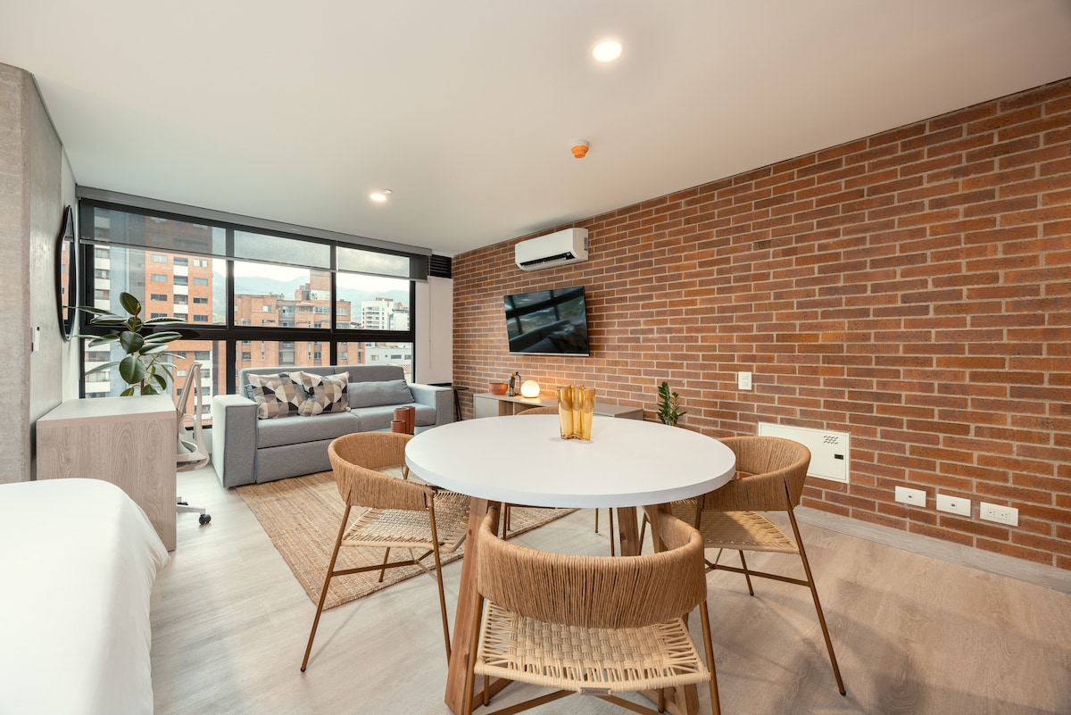 Modern apartment on the 17th floor of Hotel Urban Studios with amazing Medellin views. Just a 10-minute walk to Tesoro Mall and close to top nightlife, yet in a calm and pleasant area. Features a comfortable King bed, full kitchen, A/C, washing machine, gas dryer, fast Wi-Fi, and access to Al Alma restaurant with room service. The building includes a pool, jacuzzi, gym, work rooms and 24/7 security.