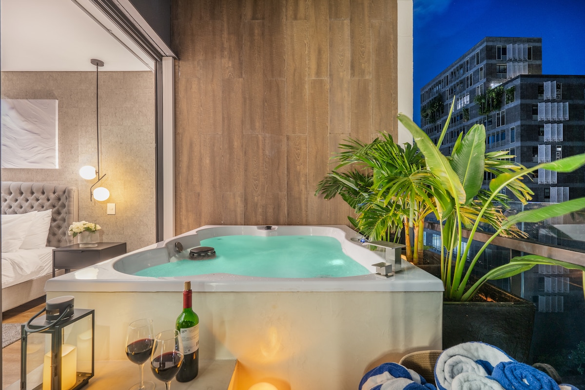 ★ Energy Living 304 → PRIVATE JACUZZI → Air conditioning in the bedroom (NEW) → Private balcony FULLY covered with retractable awning! (NEW) → Dedicated office workspace → Top of the line Herman Miller Sayl office chair → Fast 250Mbps internet → TV with cable, Netflix and YouTube → Fully equipped kitchen → Washer/dryer → Stylish modern decor → Easy check-in with doorman 24/7 → Everything you need to feel at home! → 1.5 bedroom (KING bed) / 1.5 bathrooms, 980 sq. ft/91 m2