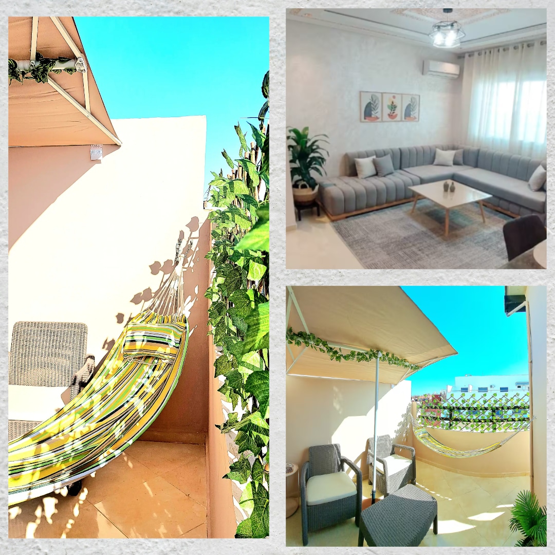 Welcome to Mehdia Enjoy this beautiful luxurious apartment, ideally located 1 minute walk from the beach, perfect for holidays for families or groups of friends. The accommodation is equipped with everything you need in a quiet and secure area and close to shops and restaurants for a comfortable stay: modern kitchen, spacious living room, TV, Wi-Fi, utensils, etc. It can accommodate up to 6 people, with additional mattresses available (not visible in the photos)