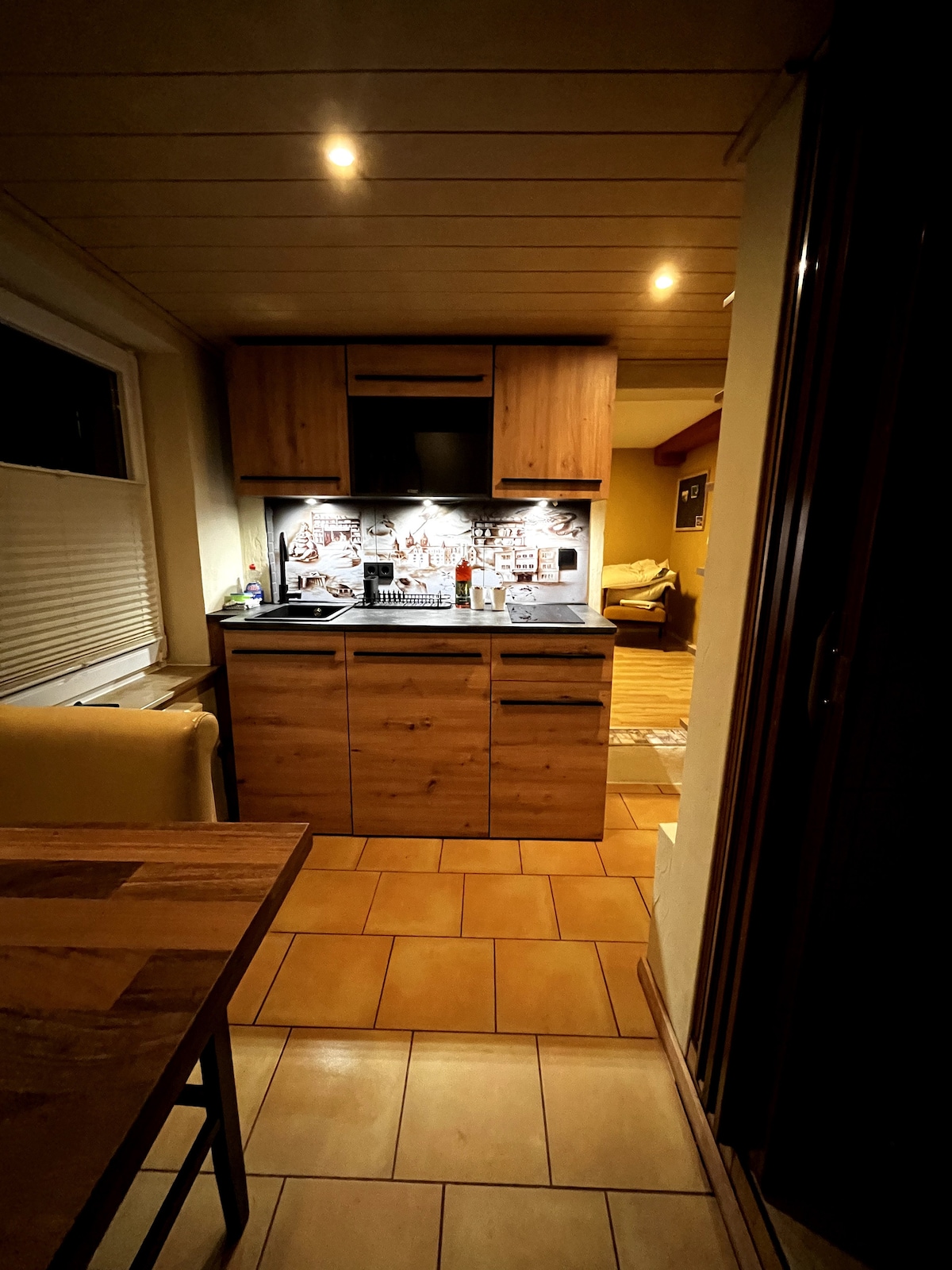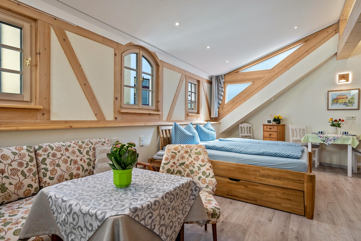 Stylishly furnished apartment on the third floor. The apartment for one person can be used as a double bed if needed with a converted bed (90 x 200 cm). It is equipped with a dresser, shelves and a wardrobe. Wi-Fi and a smart TV are available. The fully equipped kitchen offers cooktops, oven, fridge and freezer, coffee maker and kettle. The bathroom with shower offers fresh towels, toilet paper and storage space.