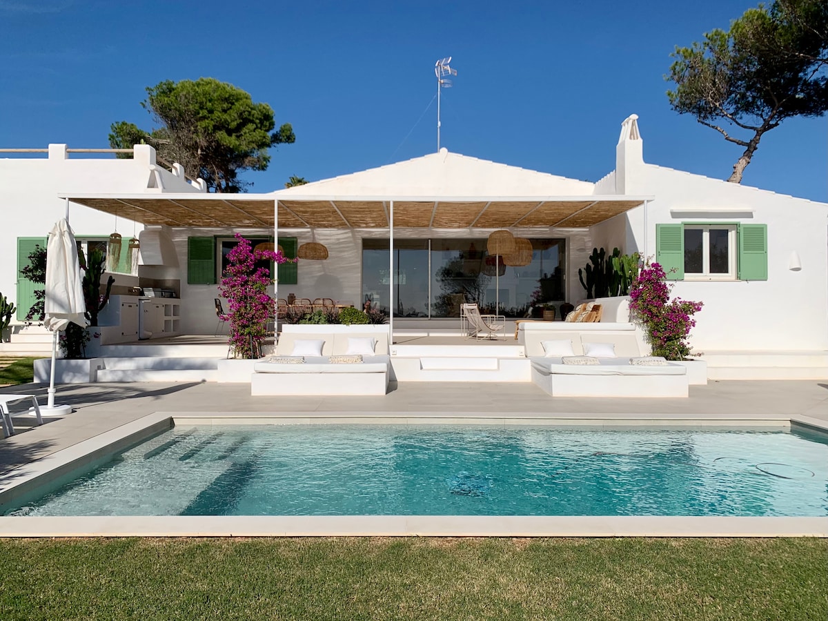 Warning! This house is exclusively on AIRBNB, Baléares Boheme and Un Viaje Unico. Beautiful modern architectural house, sea view, 5 minutes from Punta Prima beach, Sant Lluis town, 15 minutes from Mahon and the airport; HEATED POOL. FURNISHED ROOF TOP. 4 bedrooms, including a master suite, and 3 bathrooms. Entirely facing the sea and the countryside, it offers magnificent views from every room, and a lot of calm. Tourist license number ET 0399 ME