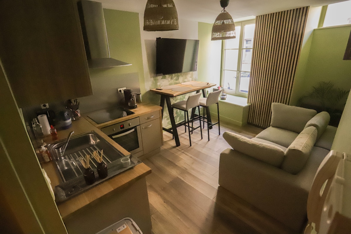 In the heart of historic downtown Dole. 2nd floor (no elevator), quiet, close to shops, restaurants and the train station (10-minute walk). Free parking nearby the space. Sleeps 2 people. Consists of a shower room with toilet, an equipped kitchen (microwave, coffee maker, kettle, toaster, air fryer, washing machine, induction stove). TV, internet access via fiber optics. The sleeping area: a double bed (140 × 190 cm). Bed linen and towels provided. Self check-in.