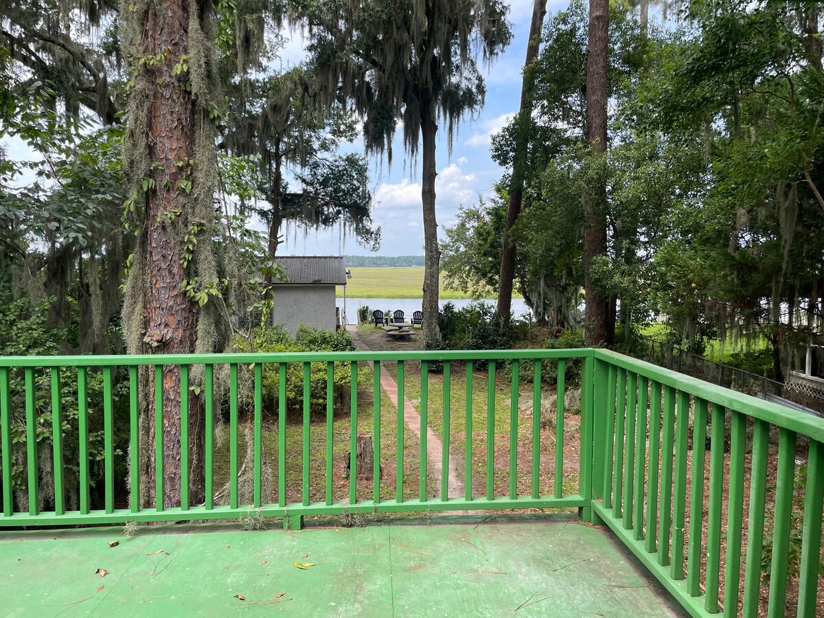 Cozy house that has modern new kitchen and baths and lots of living space. Comfortable beds and great views. Rivers and marsh as far as you can see. Walk down dock and get into your boat. Beautiful covered dock house fully equip with fresh water, lights, electricity and fish cleaning station. New floating dock with water at low tide. House has covered porch with rockers and table for eating or just sitting. Modern public boat ramp 2 miles away and 15 minutes by water. Very private and quiet.