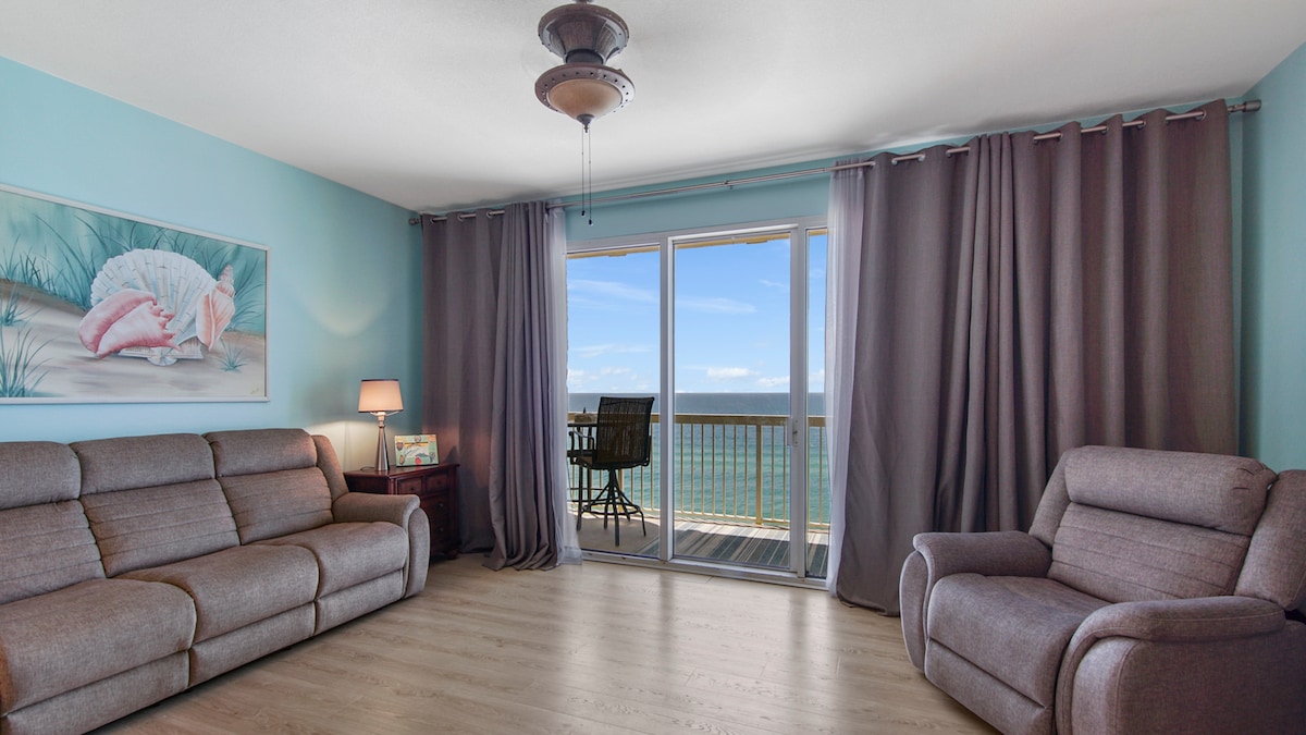 Boasting infinite Gulf views, an open floorplan, and elegant touches throughout, this deluxe, beachfront condo is guaranteed to please even the most discerning guests. The great room boasts a fantastic, full kitchen with stainless steel appliances and counter seating for three. Enjoy more formal meals together at the indoor table for six or al fresco on your furnished balcony. The cozy, sunlit living area includes a gas fireplace and a wall-mounted, flatscreen TV, while the sliding glass doors open the entire space up to the balcony. And for sleeping arrangements, this condo features three comfortable bedrooms including a "mermaid-friendly" kids' room. Guests will also enjoy access to a variety of on-site amenities including a fitness room, a seasonally-heated pool, and a hot tub.