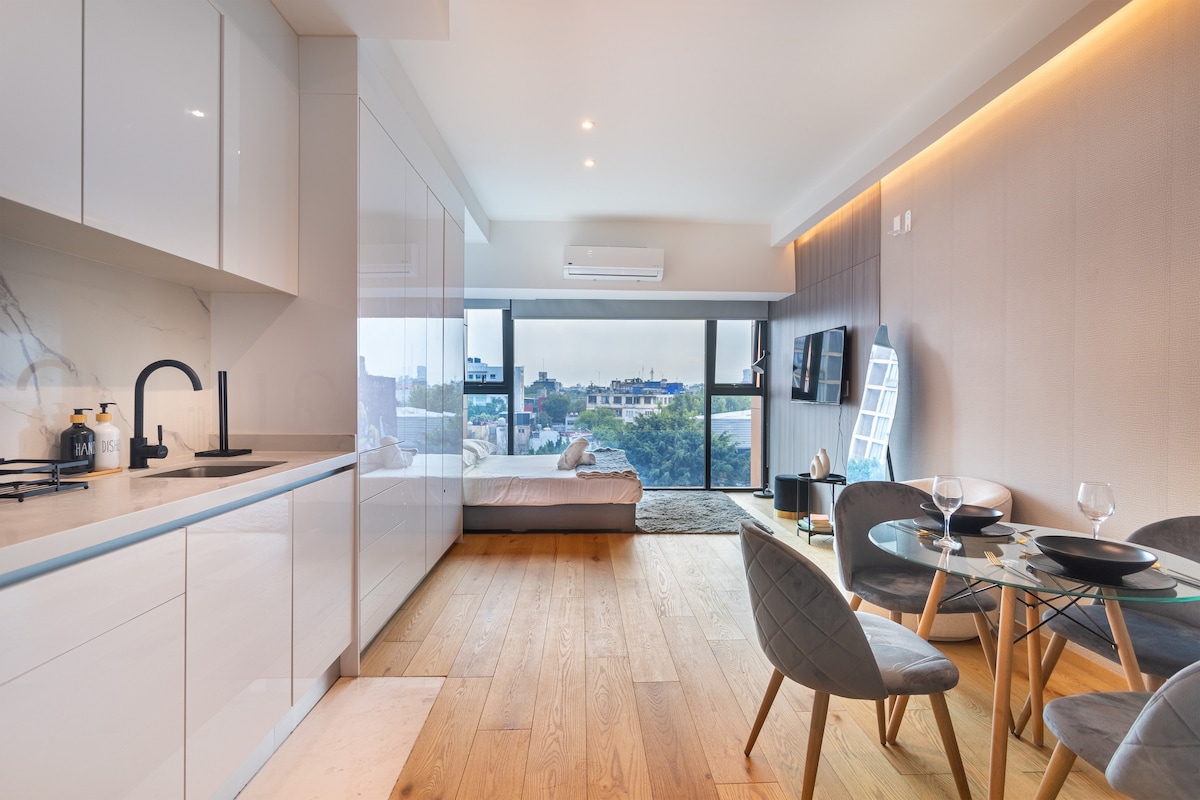 -Modern, brand new building -Rooftop terrace and brand new gym with views of Parque México and Reforma, -Fully-furnished unit designed for long stays and corporate travel -Free laundry facilities -Housekeeping service: Once a week for reservation of +7 nights Nido Parque Mexico is an incredible architectural accomplishment with the absolute best location in the entirety of Mexico City, on the corner overlooking Parque Mexico, in the heart of la Condesa. With a brutalist facade, ultra-modern in
