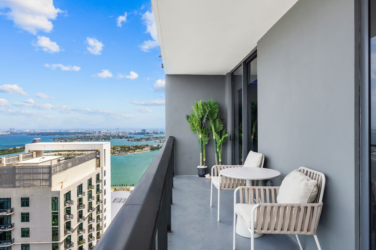 Wake up on the 47th floor to panoramic sunset views over the Miami skyline, visible from the private wraparound balcony and master bedroom. Floor-to-ceiling windows fill this modern 2BR/2BA condo with natural light, creating an open, elevated space above the city. The condo features a full kitchen with stainless steel appliances, smart TV, high-speed Wi-Fi, central A/C, and in-unit washer/dryer. Sleeps up to 6 with a king, queen, and sofa bed. Crib available upon request.