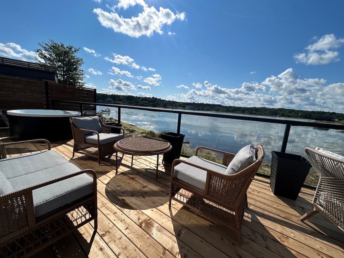 Welcome to the Edge! Standing right atop a majestic cliff, the Edge will have you experience the most stunning panoramic views of the Bay of Fundy. Beautiful ocean views will greet you wherever you are. Sitting at your dinning counter or in the comfort of the living room, taking a soothing shower or jumping in your wood-fired hot tub, enjoying a bone fire or retreating to the loft for the night... Ocean views everywhere!