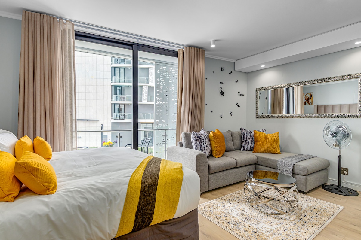 Indulge in this modern, fully furnished one-bedroom studio apartment featuring an open-plan kitchen and spacious living area that opens onto a small balcony overlooking the gym. Perfectly located near Mall of Africa, this stylish home offers comfort, convenience, and a touch of luxury for both business and leisure stays.