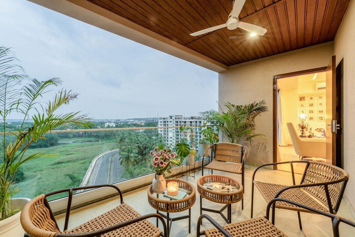 A hidden gem tucked away in Panjim's poshest zip code. Our 2BHK penthouse has a private terrace and is a short walk from Miramar beach. A Goan sanctuary surrounded by greenery; the open-plan, sprawling living room transforms into a chic space after sunset with designer ambient lighting. The famous promenade, grocery stores, and cafes are just a stroll away. Fontainhas & casinos are a short drive away. Enjoy high-speed WiFi if you’re working from home. PS: Look for peacocks in the morning!