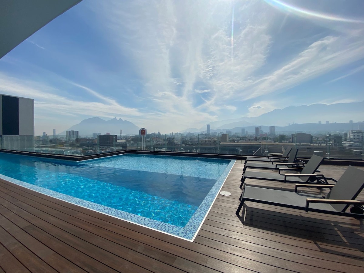 ✨ Experience Monterrey from Above 🌆 Relax in our modern 2BR/2BA apartment in San Pedro with stunning panoramic views. Two queen beds, 2 full bathrooms, fully equipped kitchen, A/C, fast WiFi, washer-dryer, parking & 24/7 security. Perfect for business, medical or leisure trips: minutes from top hospitals, Showcenter, shopping centers and the best restaurants. Ideal for short or long stays, blending the comfort of home with the boutique experience only San Pedro can offer.