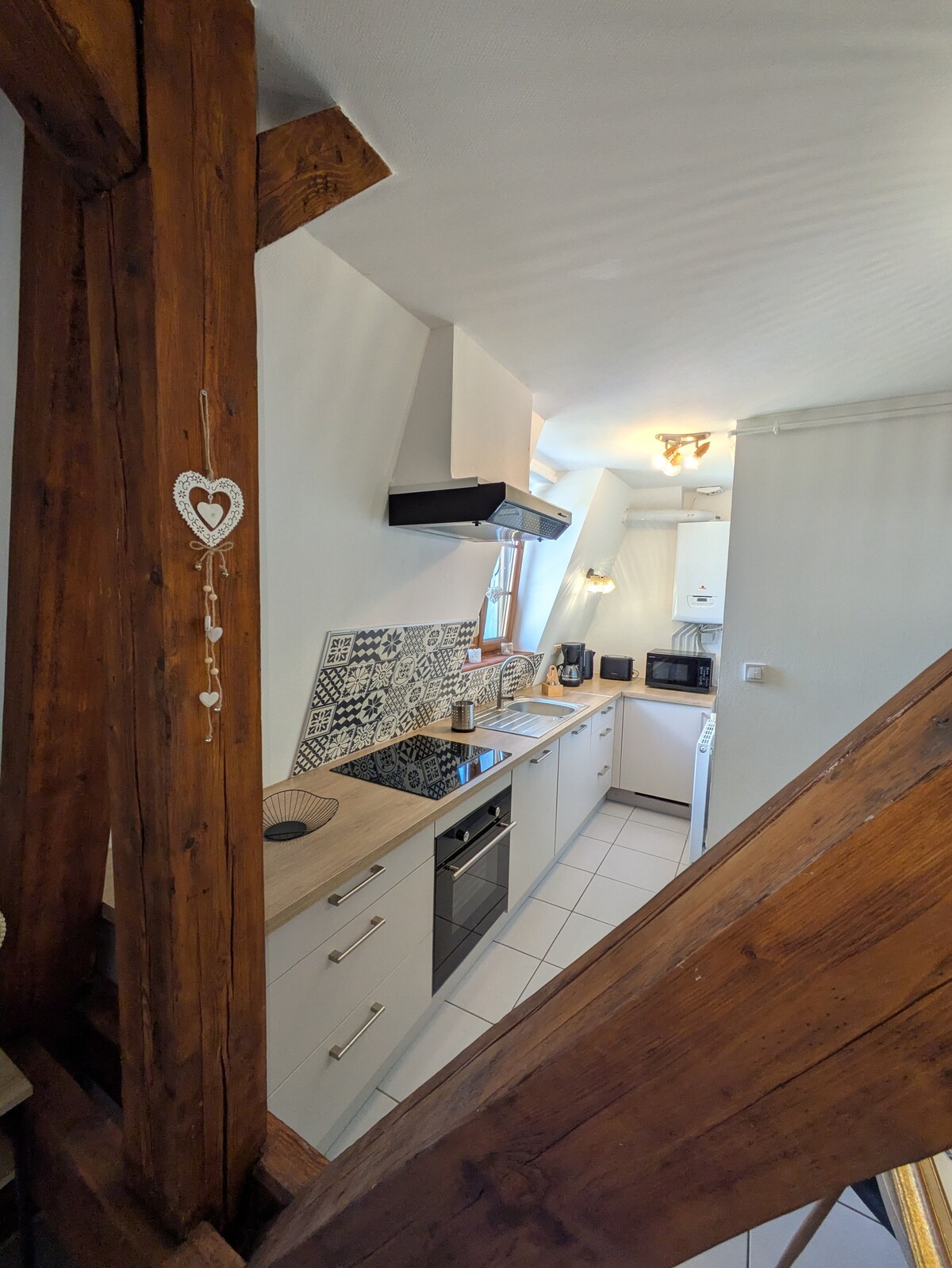 This exceptional triplex is perched between the stones of the town's ancient medieval walls. Between exposed beams, 12th-century stone walls and bay windows. 3 floors distribute the cosy nest. An entrance, a bathroom with bathtub. On the 1st floor: a space combining a kitchen, dining room, living room and access to a private terrace. Upstairs is a cozy bedroom. With independent entrance, this is an immersive experience in the medieval town of Riquewihr, and the ideal place to discover Alsace.