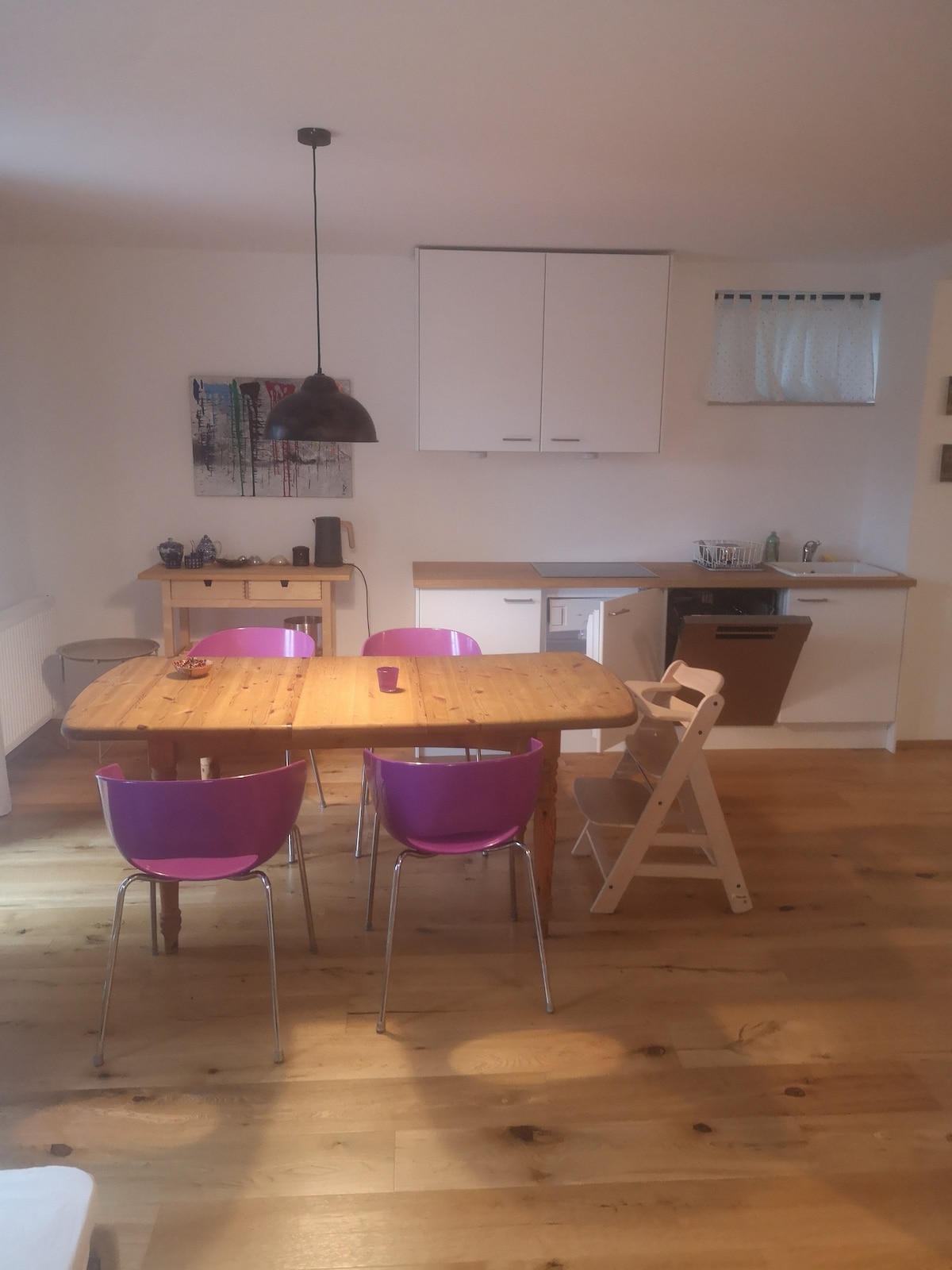Enjoy beautiful days in new central stylish accommodation about 41m²! 2 minutes walk from the train station and 5 minutes to the FH, living room/bedroom approx. 22m², kitchen approx. 10m², WC+shower+washroom approx. 5m², anteroom-cloakroom approx. 4m², living room ventilation, underfloor heating! basement! Garden/joint use! Code Systems. For children-ki bed, high chair, toys. Gladly contactless! There is the possibility to do yoga in the house for an extra charge! beautiful recreation park 1min!