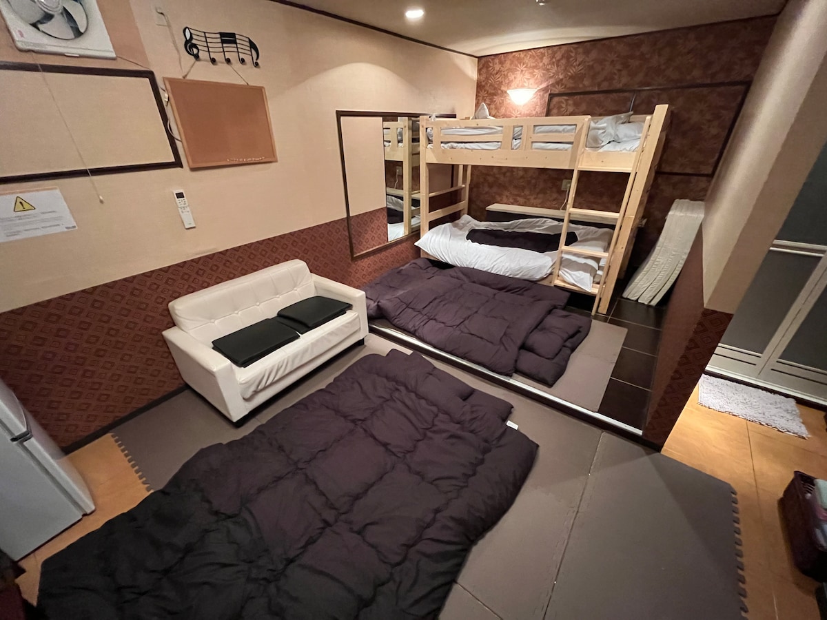 ~ A relaxing space for rent on 1 floor ~ It is an inn where anyone can relax, up to 16 people. The manager lives on the 2nd floor. Please message me on Airbnb if you have any questions. Please contact us if you are bringing a pet. We have set the following rates. 3,000 yen per dog (up to medium-sized dogs) Free facilities - WiFi Paid facilities - Coin laundry ・ Weber electric barbecue stove 2,000 yen/day Main kitchen facilities - Cassette stove - Microwave oven - Toaster - Coffee machine Bath and sink facilities - Bath towels, towels Shampoo, conditioner and Body soap - Hair dryer - Toothbrushes [Sleeping arrangements] ☆ 2 Japanese-style rooms, 8 tatami mats (8 sets of futons) ☆ Western-style room 10 tatami mats (2 sofa beds, 2 futons) ☆ Small Japanese-style room 8 tatami mats (4 sets of futons)
