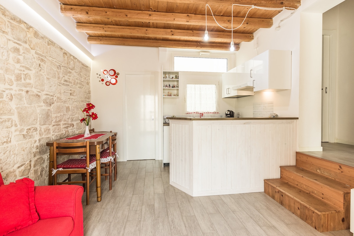 MURAGLIA With spacious and tastefully furnished rooms, the accommodation has a comfortable living area with a comfortable sofa bed, an open-plan kitchen equipped with new appliances and a master suite with an elegant open bathroom from which it is possible to exit onto the suggestive wall. Possibility of adding a camp bed for children. The accommodation is equipped with free Wi-Fi, smart TV, air-conditioning and storage for luggage and bicycles.