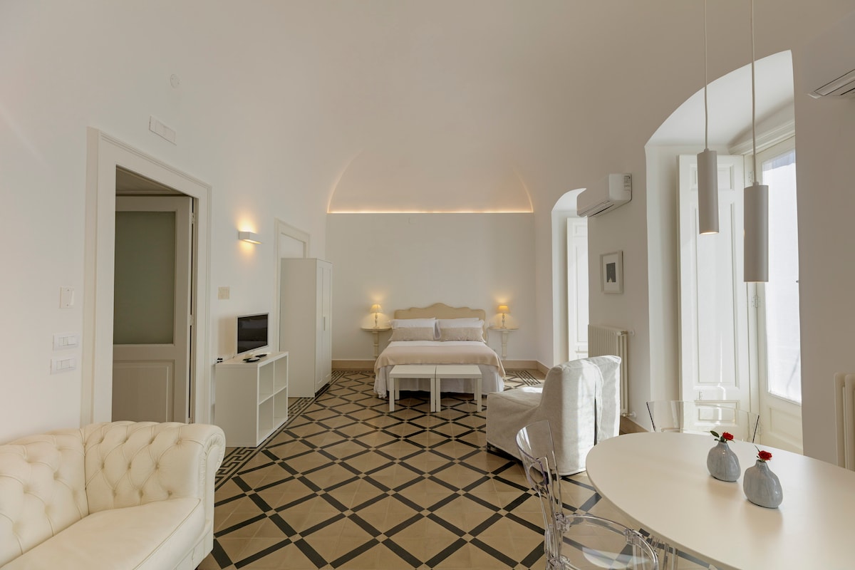 Located within the ancient Corte Forno Sant'Orsola, the stone studio, fully equipped, is just a stone's throw away from the sea and the public beach. Right in the heart of the historic centre, where the ancient communal bakehouse once stood, you immerse yourself in a unique experience, surrounded by stone, history, and the sea, getting lost in the narrow white streets and breathing in the typical air of Apulian historic centres. The area is vibrant yet peaceful, full of restaurants and bars.