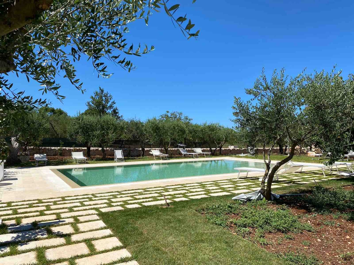 Trullo Roverella enjoys a privileged position, immersed in the quiet of carob trees and centuries-old olive trees, where time seems to slow down. It is part of an elegant complex of two properties, each designed to guarantee total privacy, with independent outdoor spaces and a private pool . The pool, facing the front of the house, is equipped with umbrellas and sun loungers, ideal for relaxing under the Apulian sun.