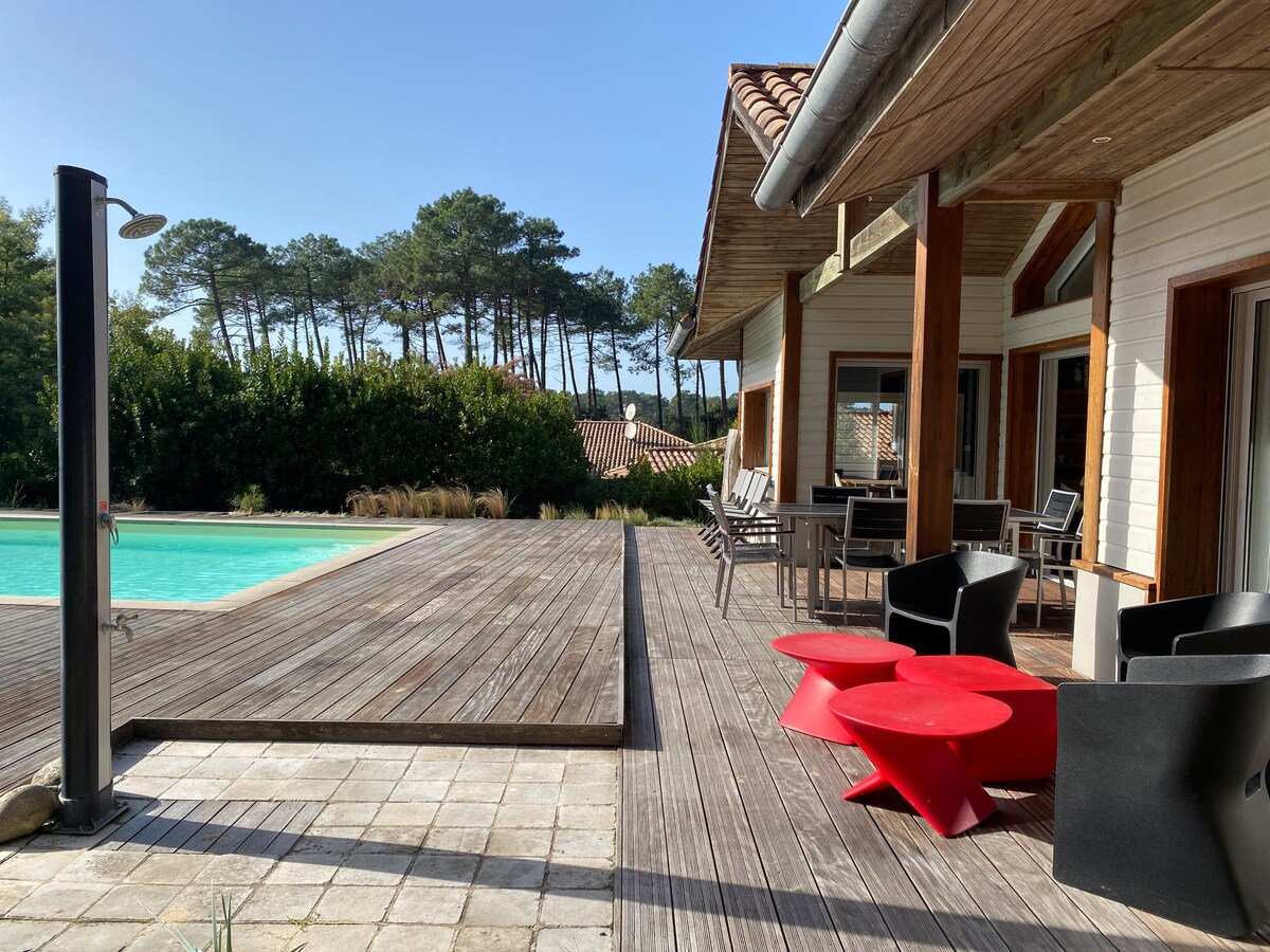 Beautiful house with Basque-Landes decoration. The Landes forest at the end of the garden, La Prade pond 300 m away, golf course 800 m away, beach 1.5 km away. 5 bedrooms, 4 bathrooms, one of which is equipped with a spa bath. Large indoor pool for a very pleasant temperature. Terrace of 130 m2 around the pool, a plancha, deckchairs, garden furniture are at your disposal. South facing with large bay windows. A courtyard lined with an umbrella.