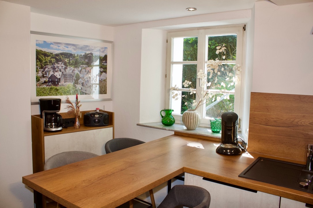 Sleep and stay in a more than 300-year-old cloth maker's house right in the heart of Monschau. When the window is open, you can hear the Rur rushing by and have a beautiful view all the way to the Red House. On cold days, the oven provides cozy warmth. We look forward to seeing you soon. Warm regards, Uta and Dietmar