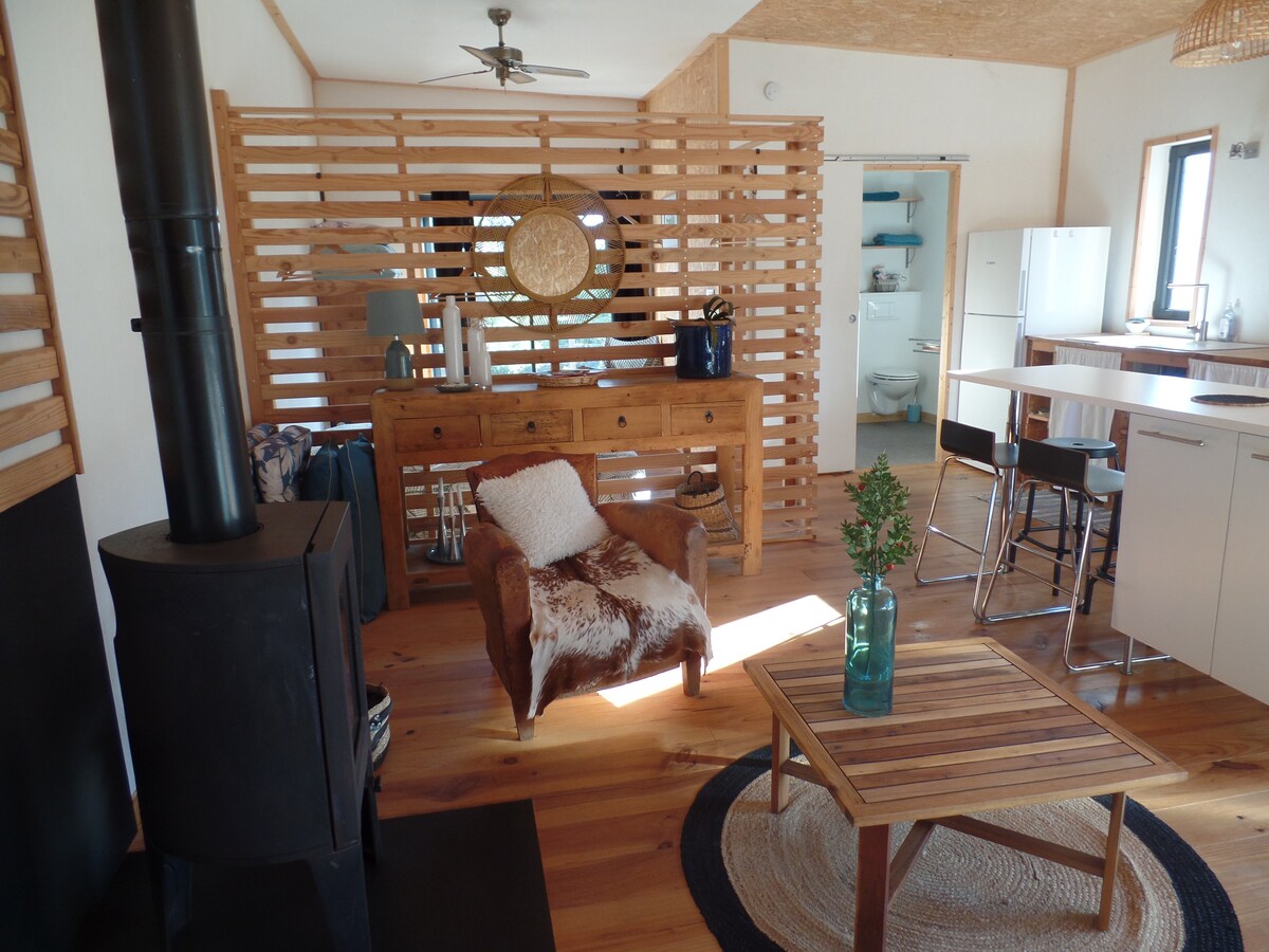 En amoureux, entre amis ou en famille, venez vous détendre entre pins et garrigue. Une terrasse en bois avec pergola, bbq, cuisine d'été, fauteuils, table et chaises, entoure le logement. Aux beaux jours, profitez des transats et en été, rafraîchissez-vous dans le spa (de juin à septembre, jamais chauffé). Si les températures sont moins clémentes, installez-vous sur la terrasse autour du brasero sous les couvertures polaires (octobre à mai)