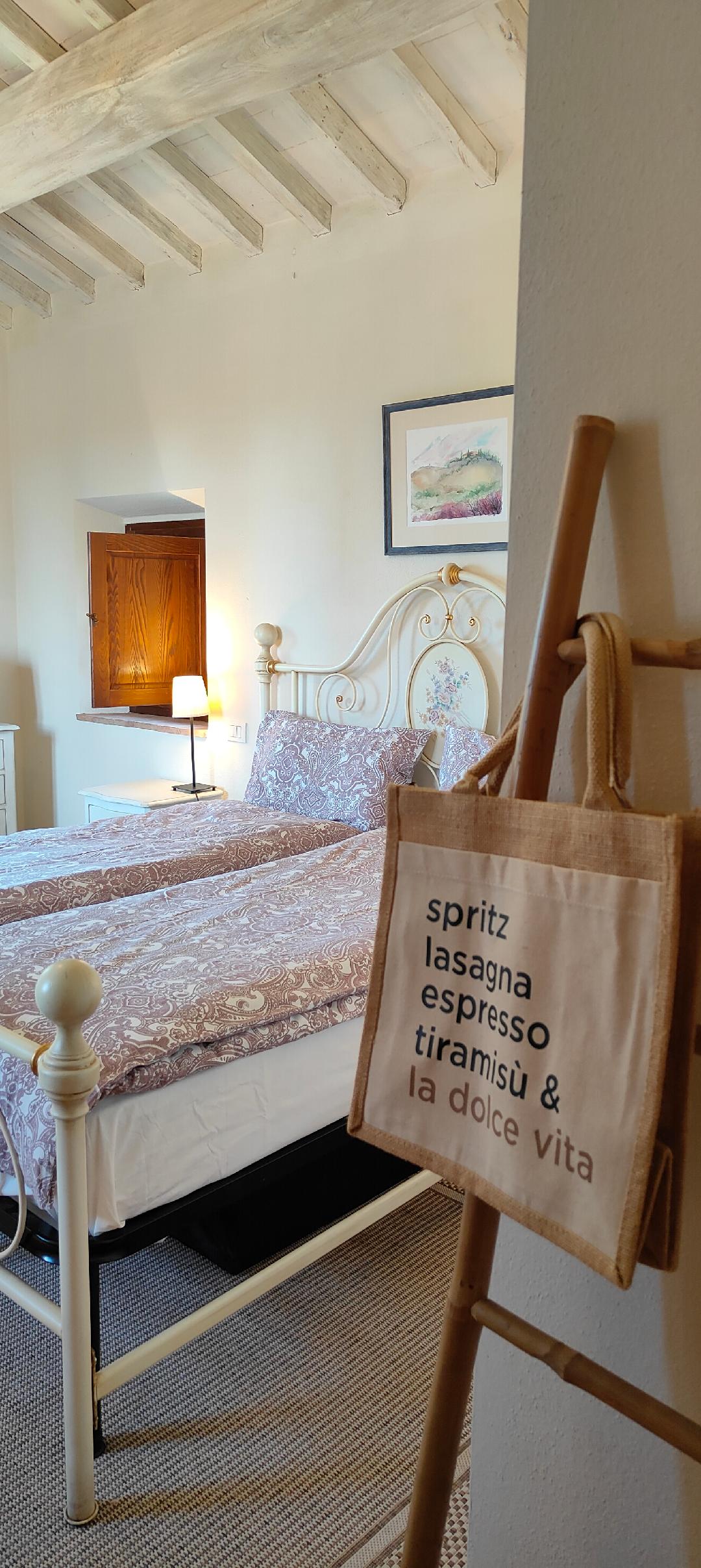 The flat is on the first floor of a classic Tuscan farmhouse called ‘Biofattoria l'Upupa’. Magnificent hillside location between the Val d'Orcia and the Crete Senesi. Suitable for families with children. Consisting of kitchen, large living room, bathroom with shower, 1 double bedroom and 1 bedroom with bunk beds. There is a double sofa bed in the living room. The flat is equipped with wifi. Free parking on private property. Complete breakfast kit including homemade cakes.