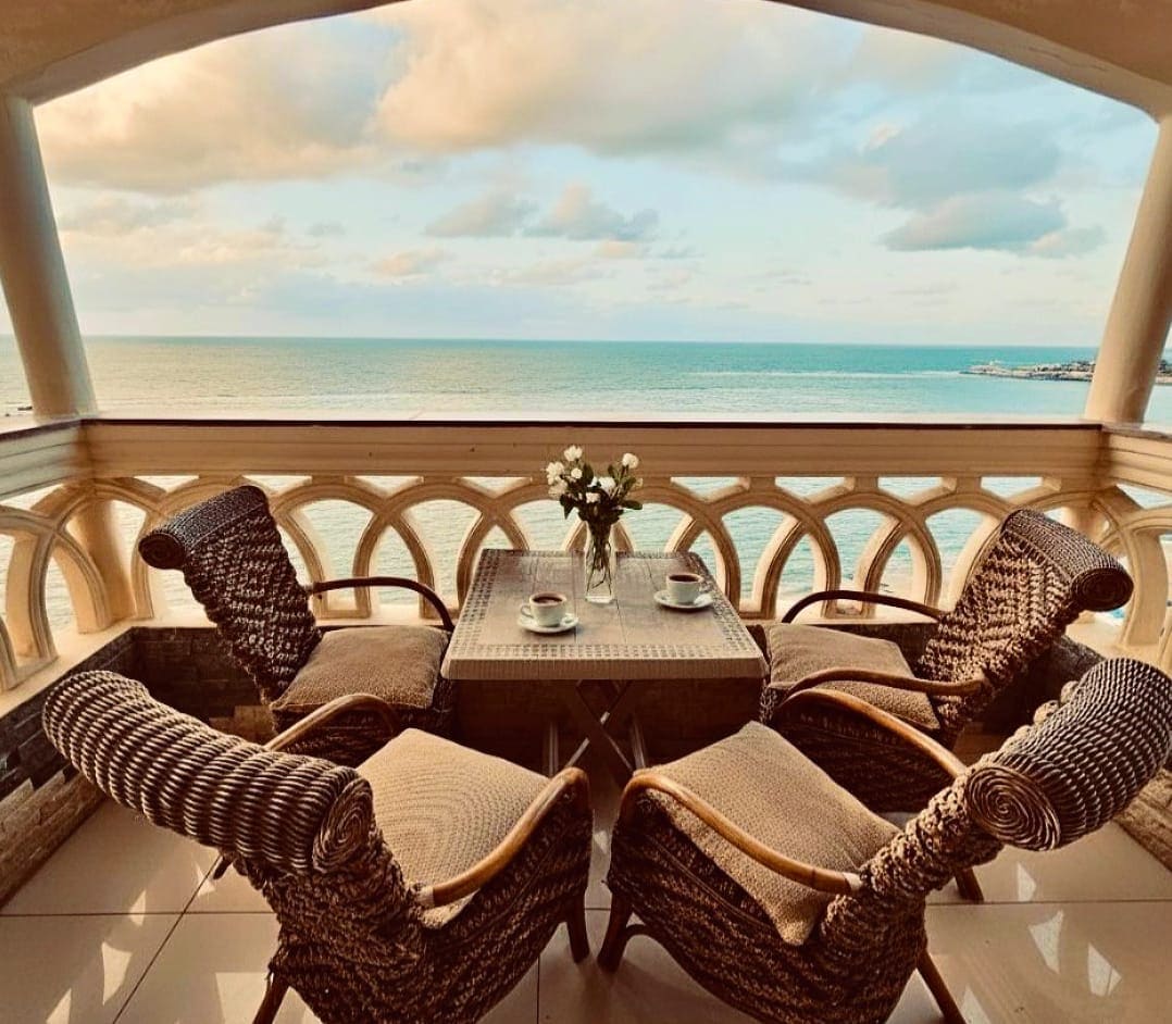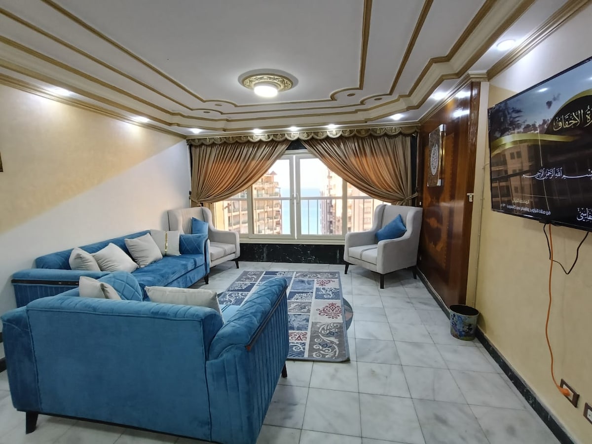A distinguished apartment on the beach of Alexandria in the Montazah area. It consists of three bedrooms with 6 beds, two bathrooms, a large hall containing a dining room, a salon, and a living room. In addition to a sea view across the width of the hall. And a large balcony containing a sofa and chairs made of wicker and classic beads. The apartment is located on the ninth floor, giving it a unique view of the beach that you will never see before.