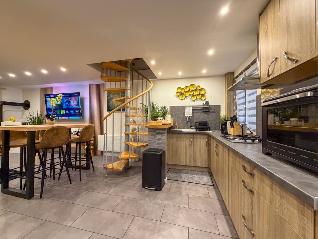 Welcome to this gem for a perfect stopover and total disconnection! Equipped and connected, you will be charmed by the warm and mineral atmosphere of the place, with woody notes, for a cozy and industrial atmosphere. Its jacuzzi with water and light effects will bring you absolute relaxation all year round. Try the sensory and unique experience, in a cave atmosphere, of the tropical shower, where stone, water and vegetation come together for a captivating feeling of well-being.
