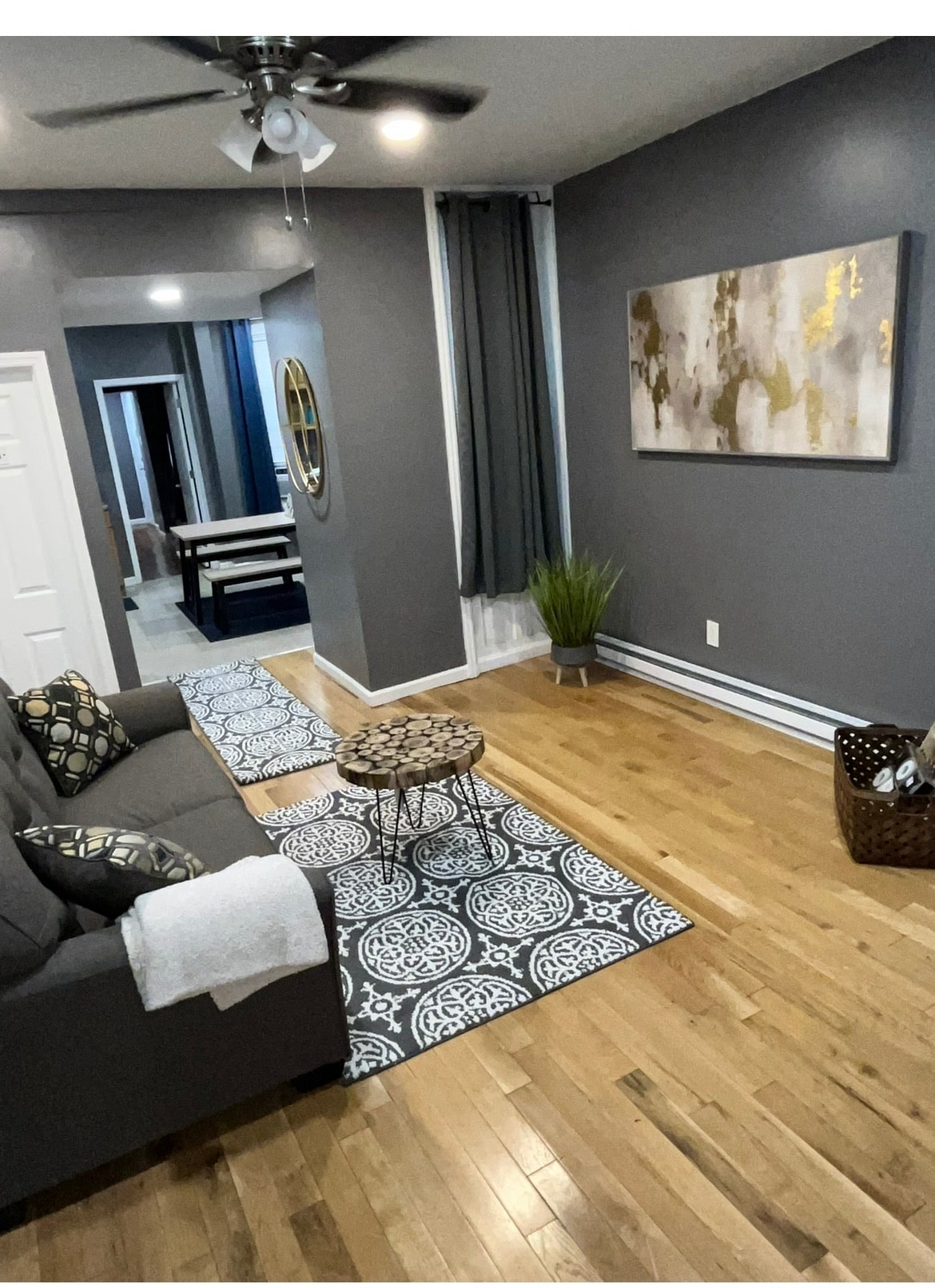 The Blueprint is a cozy 3 bedroom apartment. The home is fully renovated. Hardwood floors throughout the living room, dining room and kitchen. Cleaning supplies are provided. 3 spacious bedrooms. Two twin beds, full bed & queen bed in the master bedroom. Upstairs bathroom is elegant with a monochromatic blue decor. Lastly, there is an inclosed porch that is available for smoking. The kitchen has all updated appliances and there is an electric fire place!