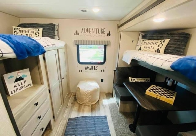 I host a 2020 Beautiful Evoke Rv. It has been well taken care of and cleaned and ready for guests. It is located in a quiet rv park in Porter Texas with an on-site laundromat and extra showers and rest rooms for you or your guests’ convenience. It has a king size bed with a sink and mirror in the master and 2 full bunks and a small sofa bed in the living area. There is an electric fireplace for heat or ambiance. There are purple lights throughout and on the porch for your enjoyment.