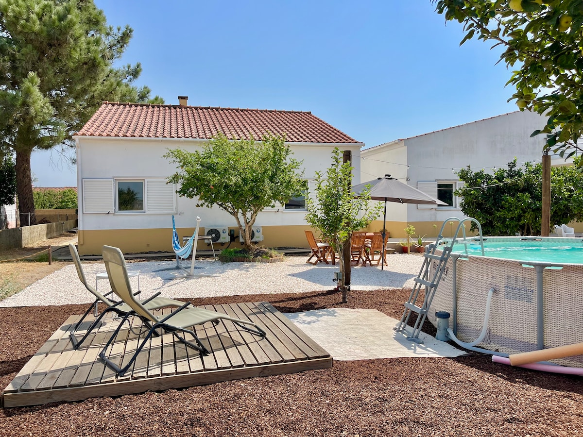 Desfrute de umas férias inesquecíveis com a familia e amigos nesta tranquila herdade com uma area de 14 hectares situada a 20 minutos de Lisboa. O espaço - - 4 quartos 3 deles com casa de banho privativa e ar condicionado - Piscina - Cozinha totalmente equipada - Sala de jantar - Zona de refeições exterior - Sala de estar espaçosa com TV, ar condicionado e lareira - Zona de Piqueniques -Jacuzzi no exterior (requer pagamento extra)
