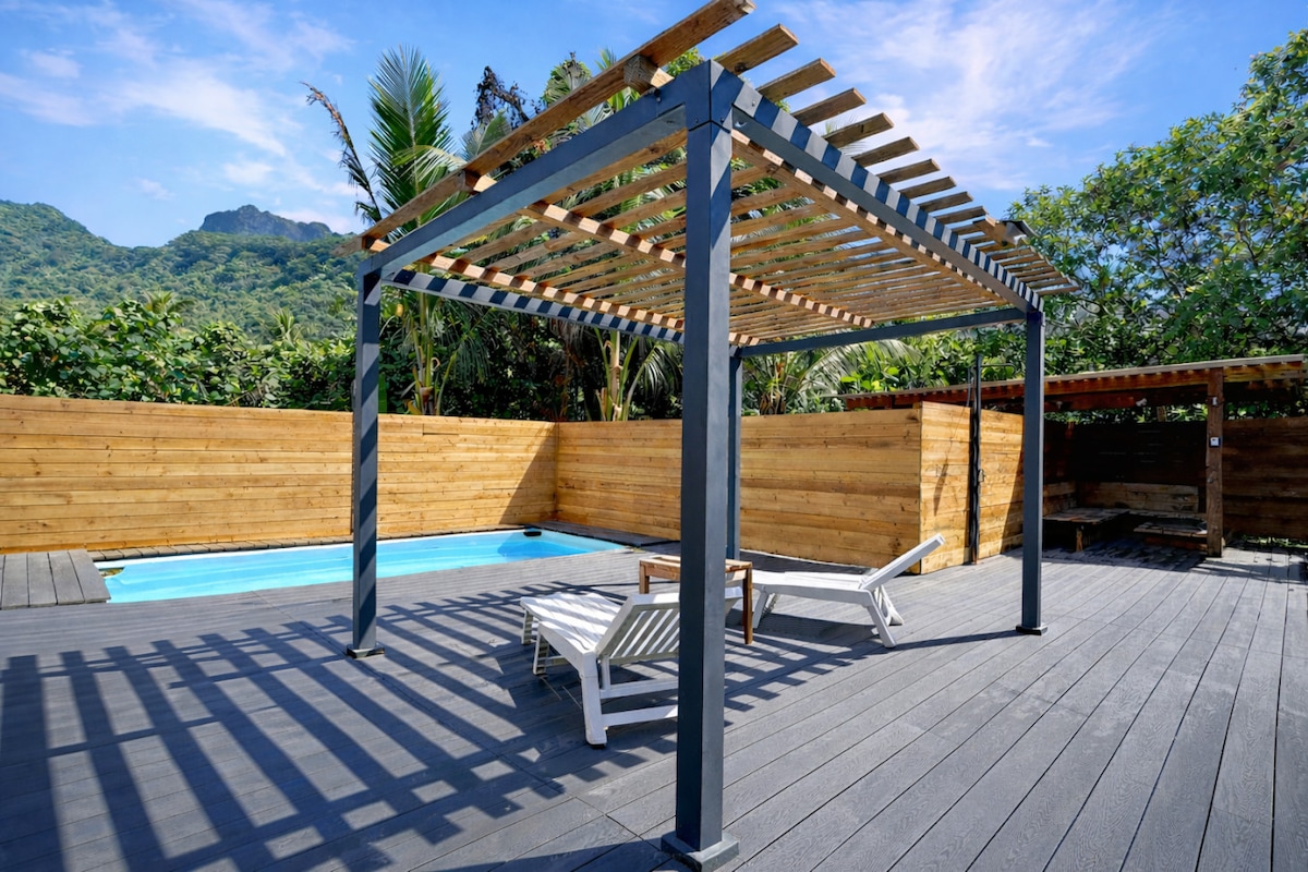"La mangue bleue" is a small cozy bungalow in a wooded garden located in a family-friendly neighborhood. The bungalow and the owner's house have the same main entrance, the two structures are separated by a tree fence, the terrace overlooks the mountain, that said you have to walk 1 minute to get to the beach which is on the other side of the road. Lani will be happy to host you from 2 p.m. and explain the surroundings.