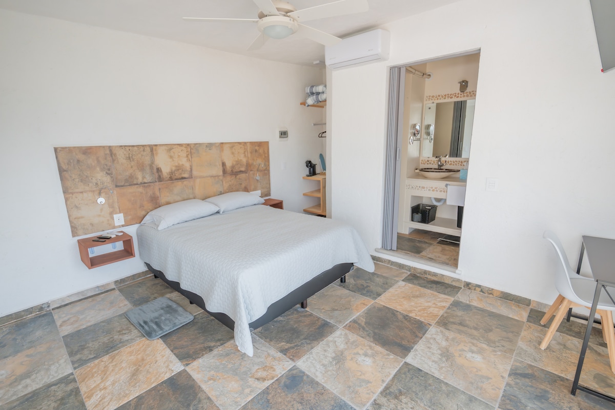 Hotel room with separate entrance, featuring: -1 Full bathroom -Hot Water - 2 towels, soap and shampoo - Sognare king-size bed and 2 pillows -Air conditioning - TV with Roku -WIFI -1 Closet - 1 roll and 2 bottles of water - One parking space per room - Room key and gate access tag Delivered clean and disinfected. "Important" Services such as cleaning (for multiple days), food, towels and extra blankets are not included.
