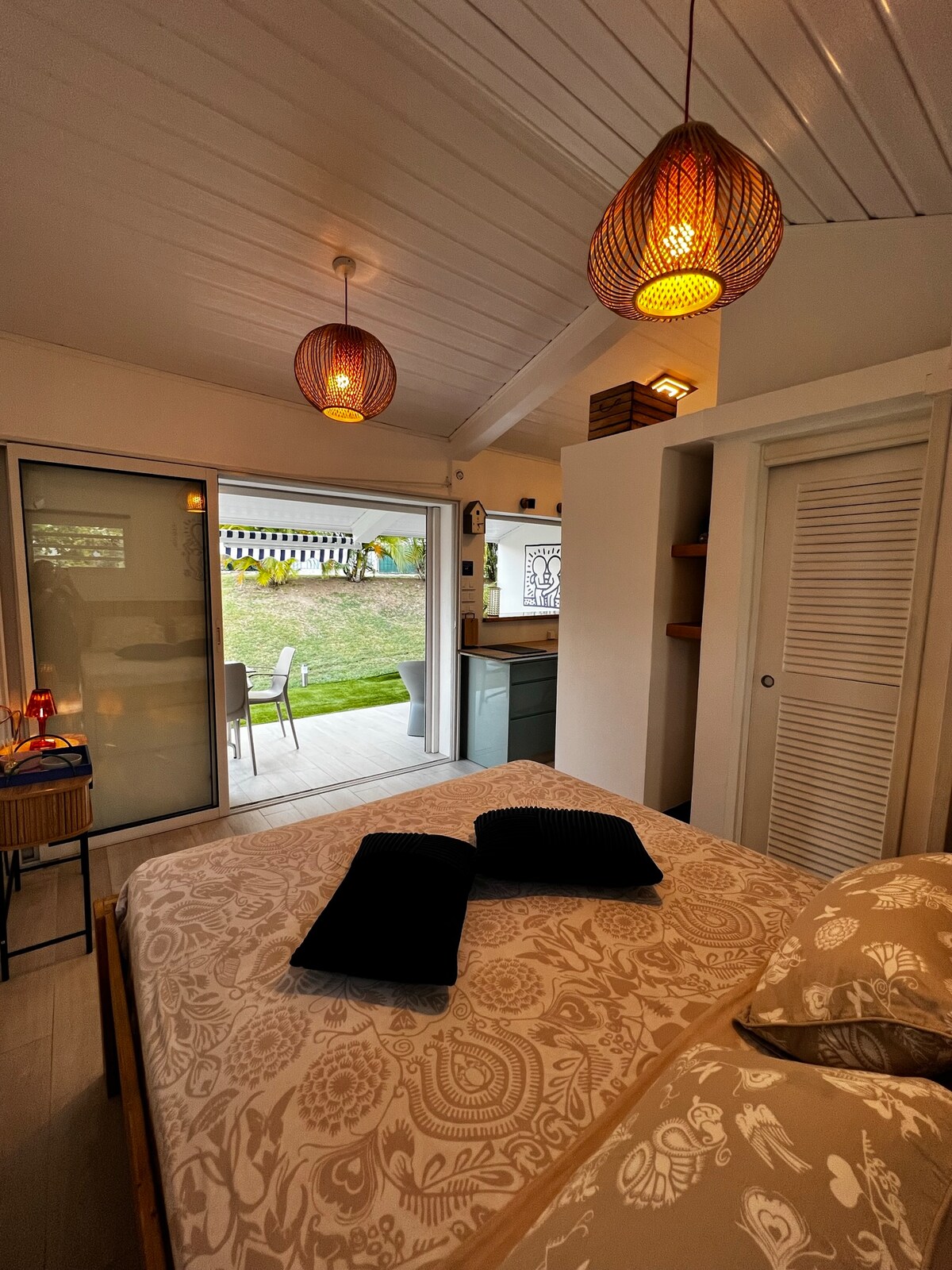 Welcome to Fabien & Laurent's, we look forward to hosting you. "Ti Campêche" is an apartment composed of: - A bedroom with a 160 bed. - A bathroom open to nature, not overlooked. - A large kitchen with all the essentials and a dining area. - A relaxation area. -A private exterior with terrace, garden and outdoor shower, view of the Baie du Diamant. There is also a large garden and a pool (3.5*7), in a shared space.