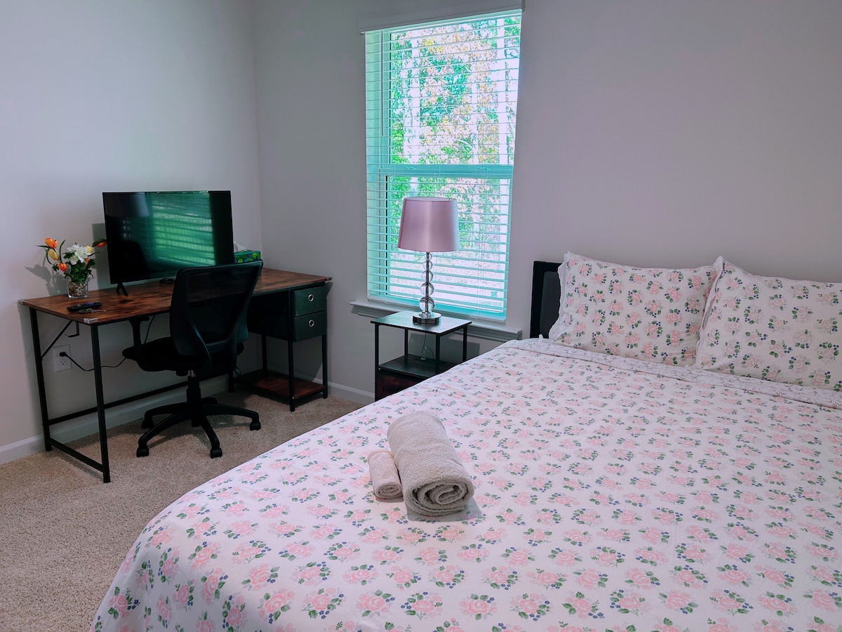 Spacious, beautiful room with two comfortable beds, a 65 inch TV for you to enjoy a hotel level experience, whether you are on a business trip or a leisure vacation, this is the perfect place for you to relax.Bring your whole family to this wonderful home and enjoy a high-quality accommodation experience. The bus stop is a 2-minute walk from the house, and it is more than 10 minutes' drive from downtown Raleigh.